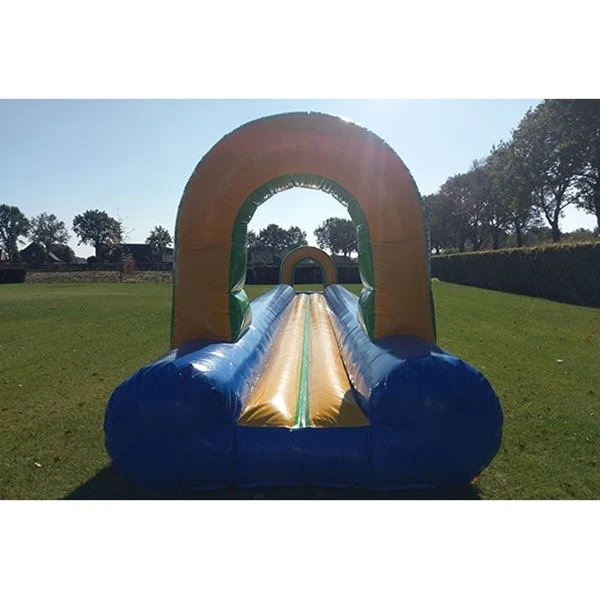 Sie können diese aufblasbare Bauchrutsche nur mit Wasser benutzen, mit einem guten Anlauf werden Sie es bis zum letzten Bad mit Wasser schaffen oder auch nicht. Wenn Sie besonders schnell rutschen möchten, können Sie Seife auf der Bauchrutsche verwenden. Wir empfehlen grüne Seife für das beste Ergebnis, aber Sie können auch Spülmittel verwenden. Nach Gebrauch muss die Bahn trocken und sauber zurückgegeben werden, planen Sie also etwas Zeit ein, um die Bahn wieder zu trocknen. Sind 15 Meter nicht lang genug? Wir haben auch eine XXL-Bauchrutsche von 23 Metern in Gemert zu vermieten.