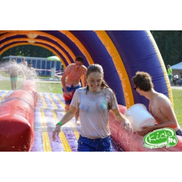 Het regende pijpenstelen, maar dat heeft de pret niet kunnen bederven. De attractie was snel opgezet en afgebroken. (al was een gebruiksaanwijzing wel gemakkelijk geweest om te beginnen) De regen zorgde voor extra uitdagingen, maar dat maakte het eigenlijk nog leuker en grappiger.