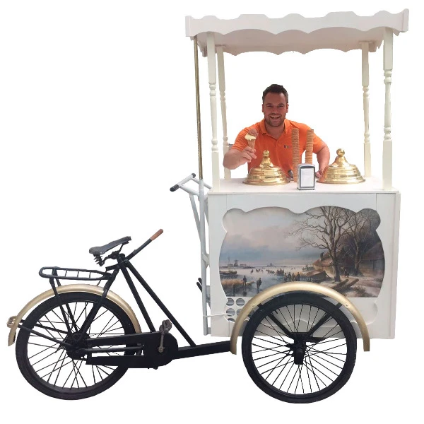 Sie möchten Ihre Gäste, Kollegen oder Freunde mit einem Eis überraschen? Dann ist unser nostalgischer Eiswagen genau das richtige für Sie. Wir vermieten unseren handgefertigten Eiswagen nur inklusive Eis, Betreuung und Transport. Die Eismenge sowie die Stundenanzahl für das Verteilen, bestimmen Sie. Das Eis Fahrrad hat eine integrierte Tiefkühltruhe und benötigt einen normalen 230 Volt Anschluss.