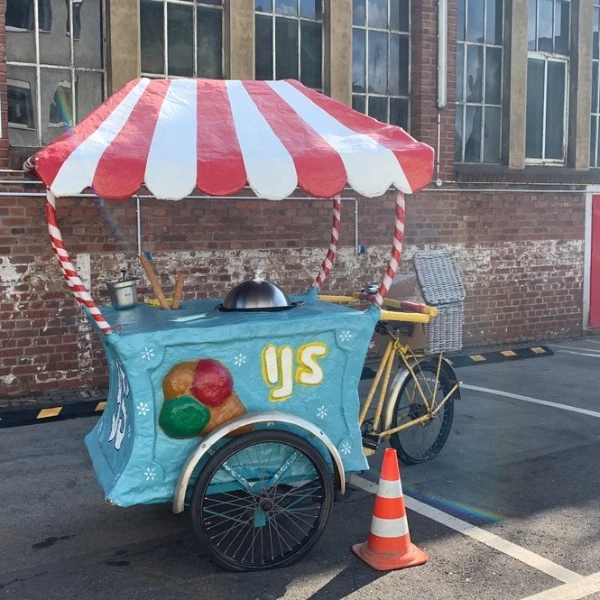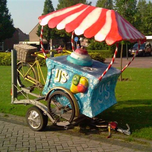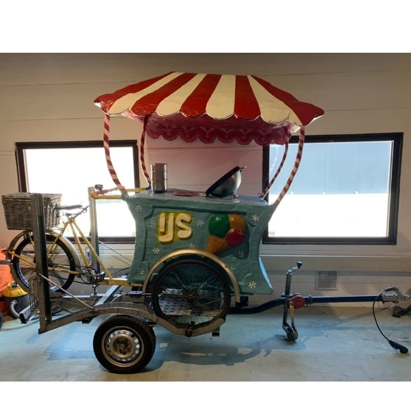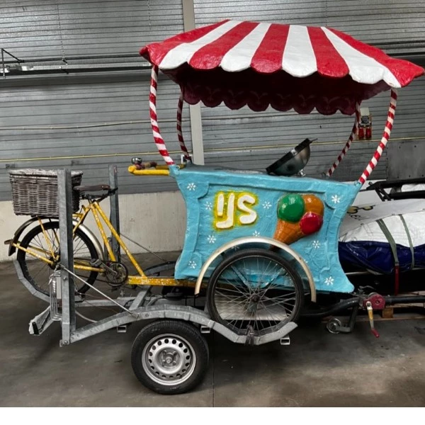 Kaufen Sie jetzt diesen einzigartigen gebrauchten Eiswagen auf einem Lastenfahrrad, komplett mit praktischem Anhänger! Dieser ehemalige Miet-Eiswagen ist ein echter Hingucker und perfekt für den mobilen Eisverkauf auf Märkten, Veranstaltungen oder Partys. Dank seines nostalgischen Designs und der robusten Konstruktion ist dieser Eiswagen garantiert ein Hingucker für Jung und Alt.