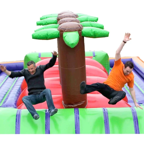 Nachdem die erste Hürde genommen ist, folgt die nächste Herausforderung. Du musst so schnell wie möglich über die doppelten roten Bälle hinweg kommen aber Vorsicht! Dein Gegner könnte auf den selben Ball wie du springen und dann wirst du schneller in die Luft katapultiert als du dich auf den nächsten Ball retten kannst. Wenn du auch diese Challenge gewinnst, wartet nach kurzem Klettern ein freier Fall aus 3,5 Metern Höhe auf dich! Dann gelangst du in unsere Dschungel Hindernisbahn, in der es auch noch verschiedene Hürden zu meistern gibt. Am Ende erwartet dich noch die Kletterwand aber einmal oben angekommen gleitest du entlang der Palmen ins Ziel! Wer bezwingt den Hüpfburgen Parcours als erstes?