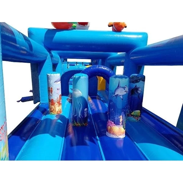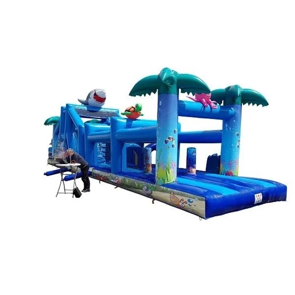 Das Besondere an diesem Hindernisparcours ist sein Sealife-Thema. Riesige Oktopusse, freundliche Fische, Korallenriffe und Elemente des blauen Ozeans machen ihn nicht nur zu einem unterhaltsamen, sondern auch zu einem wunderschönen Anblick. Es ist die perfekte Ergänzung für Sommerfeste, Nachbarschaftspartys, Sporttage oder Mottopartys wie „Unterwasserwelt“ oder „Sommer-Spaß“.