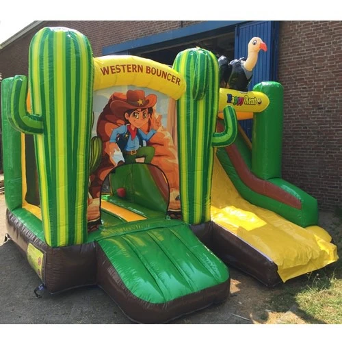 Zurück in den Wilden Westen mit dieser tollen Hüpfburg Western! Die kleine überdachte Springburg mit Rutsche lässt jeden kleinen Cowboy und jedes kleine Cowgirl die spannendsten Abenteuer erleben. Die Huepfburg im Western Style ist ausgerüstet mit einer Rutsche, sodass die Kinder neben dem Hüpfen auf der Springburg auch nach Herzenslust die Rutsche herunter rutschen können.