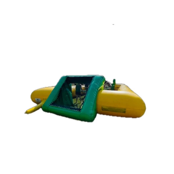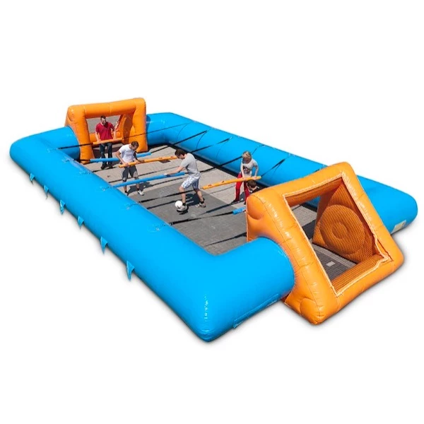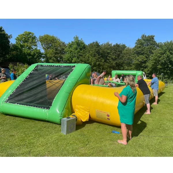Die Größe dieses lebenden Fußballspiels ohne Boden beträgt 11 x 7 x 2 Meter und wird inklusive Fußball, Gebläse und Zubehör geliefert. Dieses Tischfußballspiel ist in der Farbe Gelb/Grün erhältlich. Sehr empfehlenswert für jeden (Fußball-)Verein, jeden Mannschaftsausflug oder Six-Camp-Event.