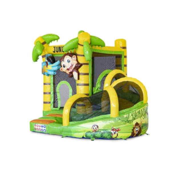Dit vrolijke en compacte springkussen met Jungle thema is ideaal voor de kleinere kinderen. Dankzij het springvlak, gecombineerd met de originele ronde glijbaan, zullen kinderen met veel plezier springen en glijden! Uniek aan de Mini met Slide is de glijbaan die aansluit op de opstap. Kinderen kunnen makkelijk het springkussen weer in en krijgen geen vieze voeten.
