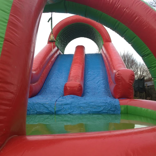 Kaufen Sie jetzt diese professionelle, gebrauchte aufblasbare Wasserrutsche von Sidijk inklusive Landebecken und 2 Gebläsen! Diese spektakuläre Wasserrutsche mit beeindruckenden 18 Metern Länge, 4 Metern Breite und 5 Metern Höhe ist ein echter Publikumsmagnet bei jeder Sportveranstaltung, Firmenfeier oder Freizeitveranstaltung.